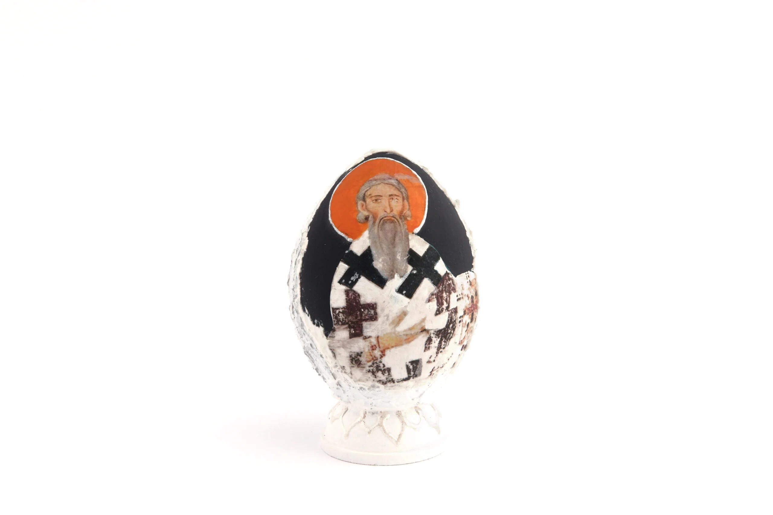 Бело, дрвено, декоративно јаје са осликаном иконом Светог Саве.
