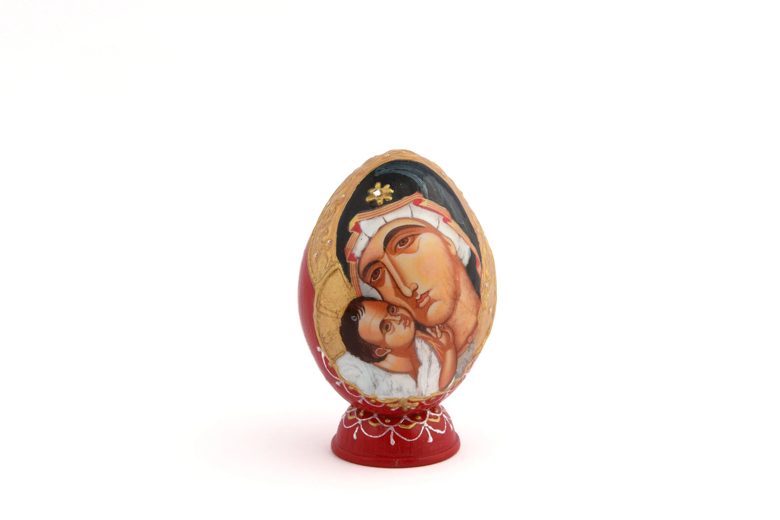 Црвено, дрвено, декоративно јаје са осликаним ликом Богородице и Исуса Христа.