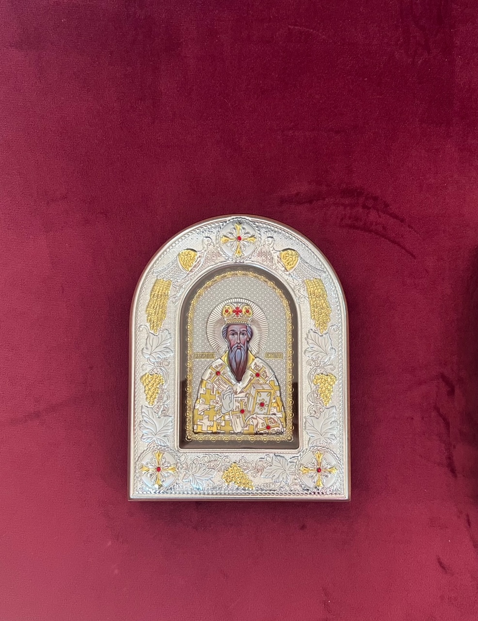 Икона је урамљена у златно-сребрни ливени рам са ливеним приказом светитеља .